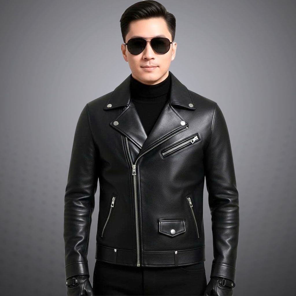 - Áo khoác da nam kiểu sơ mi cổ đứng khoá kéo bền bỉ. Tay áo dạng khóa kéo lạ mắt