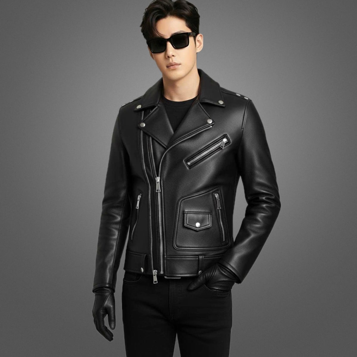 - Áo khoác da nam kiểu sơ mi cổ đứng khoá kéo bền bỉ. Tay áo dạng khóa kéo lạ mắt